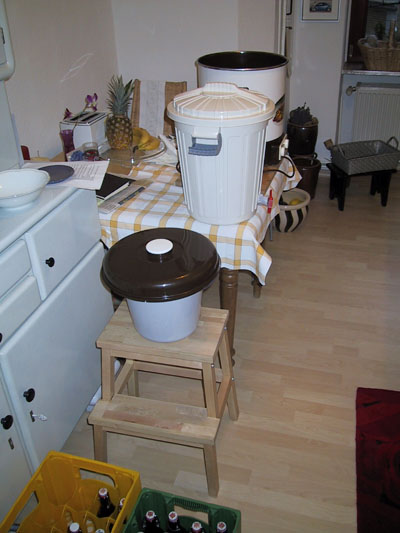 Die Brauanlage im Überblick, hinten Maischebottich (Weck-Topf 29l 1,8 kw), davor Läuterbottich (Mülleimer 23 l), davor Hilfseimer und vorne die Flaschen.