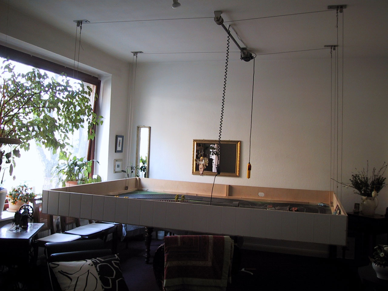 Das nächste Bild zeigt die Platte in unserem Wohnzimmer. Der Hebemotor ist eine Seilwinde für eine Werkstatt mit 125 kg Zuglast. Nach Vertäfelung der Bahn