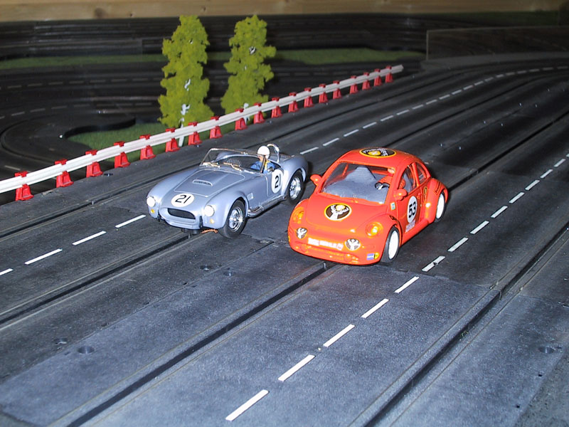 vorne leuchten sehen. Obwohl der Beetle sehr liebevoll getunt wurde, hat er gegen die Cobra mit Ninco NC2 Motor, nachgerüsteten Magnet und Fahrerin Tine keine Chance. Das Photo wurde per Lichtschranke ausgelöst.