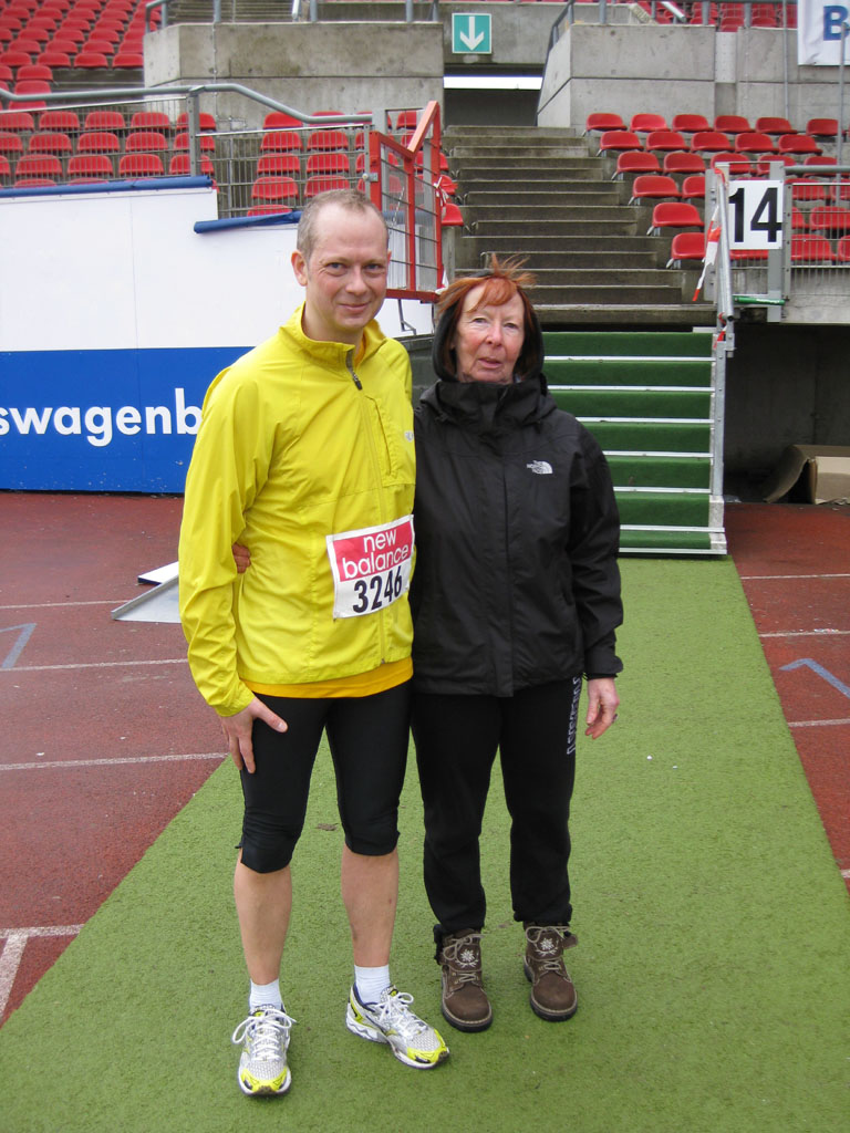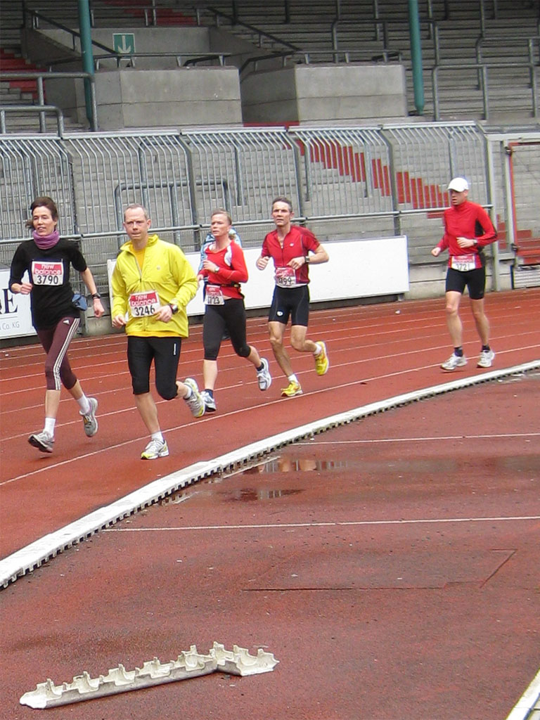 5mal durch das Stadion. Vorgenommen hatte ich mir eine Zeit zwischen 1:40 und 1:45 Stunden, wenn es gut läuft unter 1:40 Stunden. Vor und beim Lauf gab es einige Regenschauer, es war aber mit gut 12°C