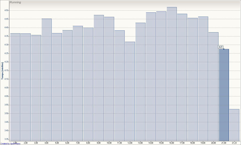 in 4:50Min/km gelaufen. Das spürte ich den Rest der Woche bei jedem Lauf, deshalb habe ich auch beim langen Lauf die letzten 10km in Marathontempo weggelassen und bin das langsame Tempo weiter gelaufen, 32km mit