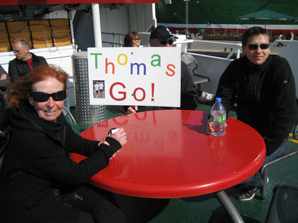 vielen Dank noch mal für das Super Schild, konnte ich immer schon von weiten sehen und freute mich. Bild 7: Mit Finisher Medaille und Bier. Bild 8: km-Zeiten.