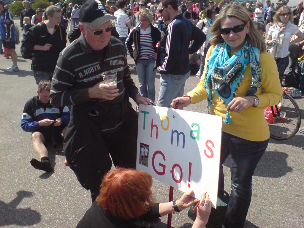 1: Vor dem Start ist mir noch kalt! Bild 2: Startaufstellung. Bild 3: Konzentriert bei km 12. Bild 4: Der Fan-Club hat es gut! Bild 5: Nur noch wenige Meter, Endspurt! Bild 6: Unterschrift auf dem Fan-Club Banner,