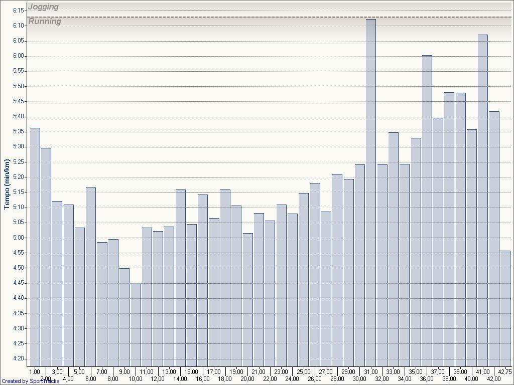 ich kam nicht auf mein angepeiltes Tempo 5:10 Min/km. Dies versuchte ich dann zwischen km 5 und 10 auszumerzen und lief zu schnell. Zwischen km 10 und 30 lief ich recht konstant mein Tempo, ab km 30 wurde ich aber