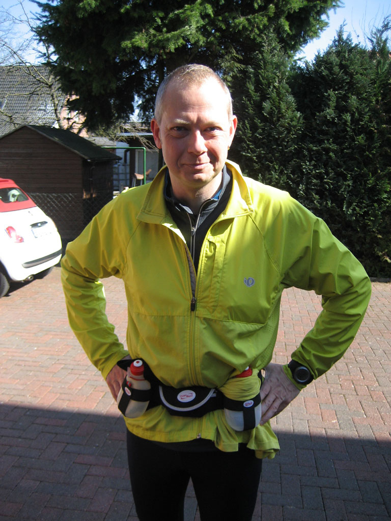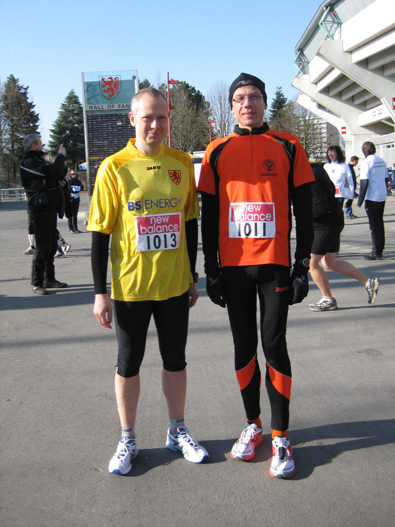 mein Fuß doch ordentlich und erschöpft war ich auch. Das Wetter war aber prima, zwar morgens noch kalt mit 3 °C, aber sonnig und die Temperatur stieg während des Laufs. Am Start standen Ingo, Arne und
