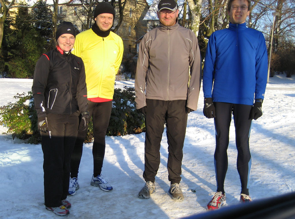 Ausgleich eine 15 km Runde im Schnee gedreht, gefühlt waren es aber 17 km und mehr. Samstag, den 10.1., sind wir (Jenny, Ingo, Uwe und ich, siehe Bild rechts) im Bürgerpark und Südsee bei Schnee 12