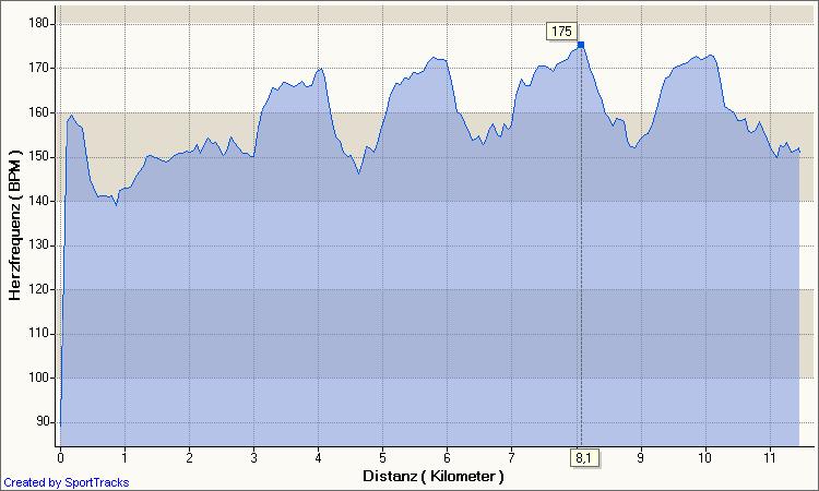 Zielzeit noch mal nach unten korrigiert auf 1 Stunde 45 Minuten. Den Lauf (5 km Runden mit 1 km Einführungsrunde) ging ich mit Arne zusammen an, Ingo setzte sich wieder nach vorne ab und das letzte Mal