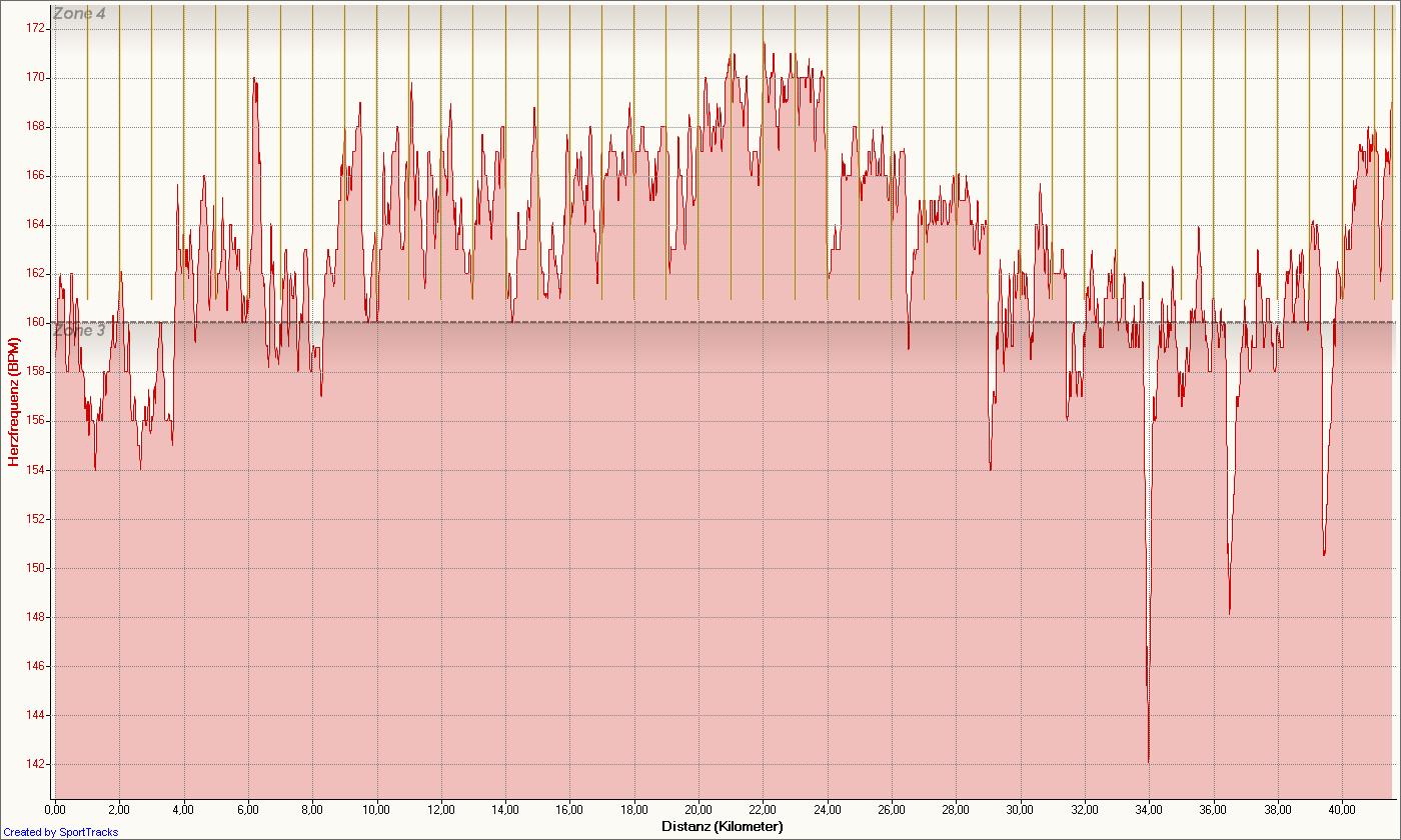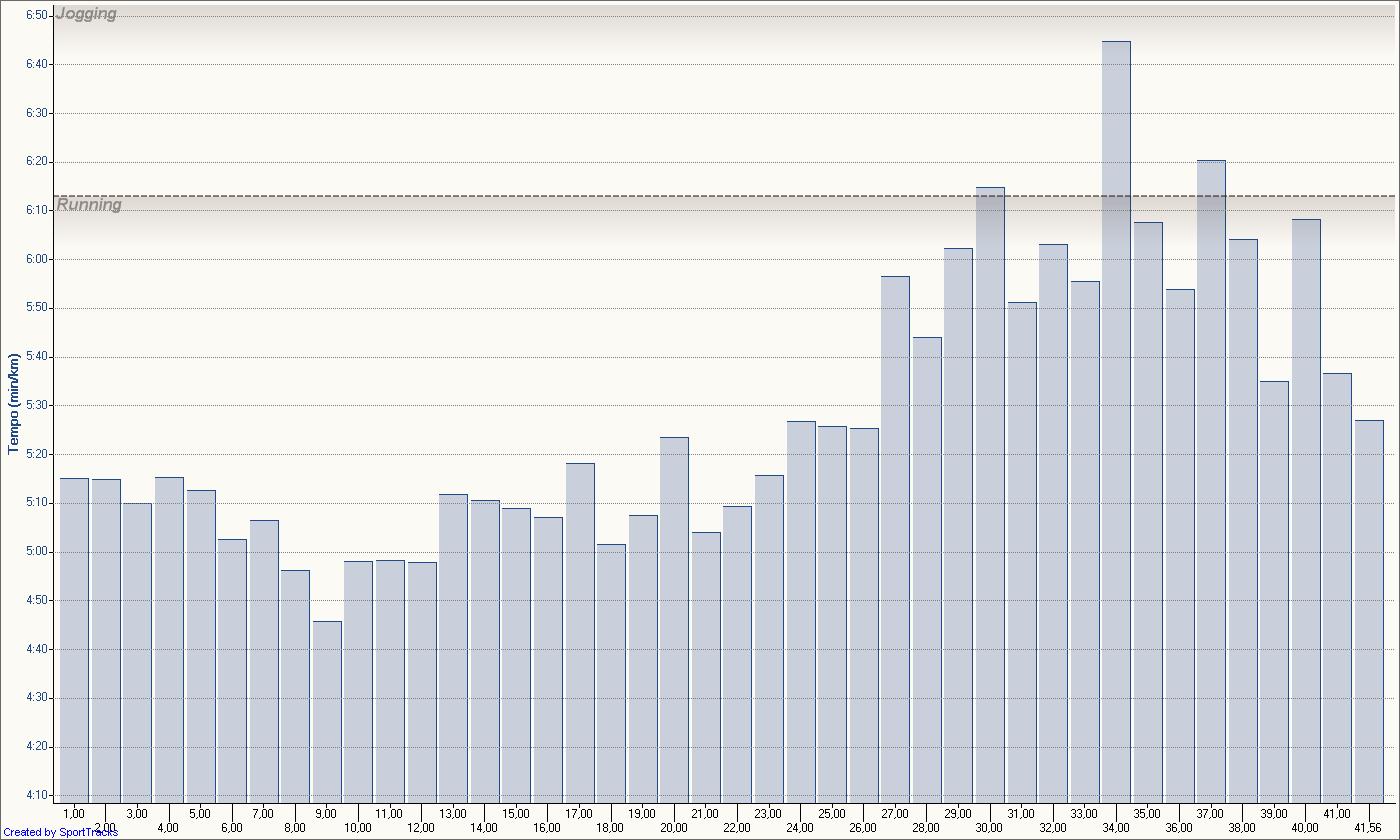 bedingt durch mein langsameres Tempo auch häufig überholt, selbst überholte ich aber Geher, gegangen bin ich außer bei der Verpflegung aber nie. Nach km 35 ging es mir wieder ein wenig besser und